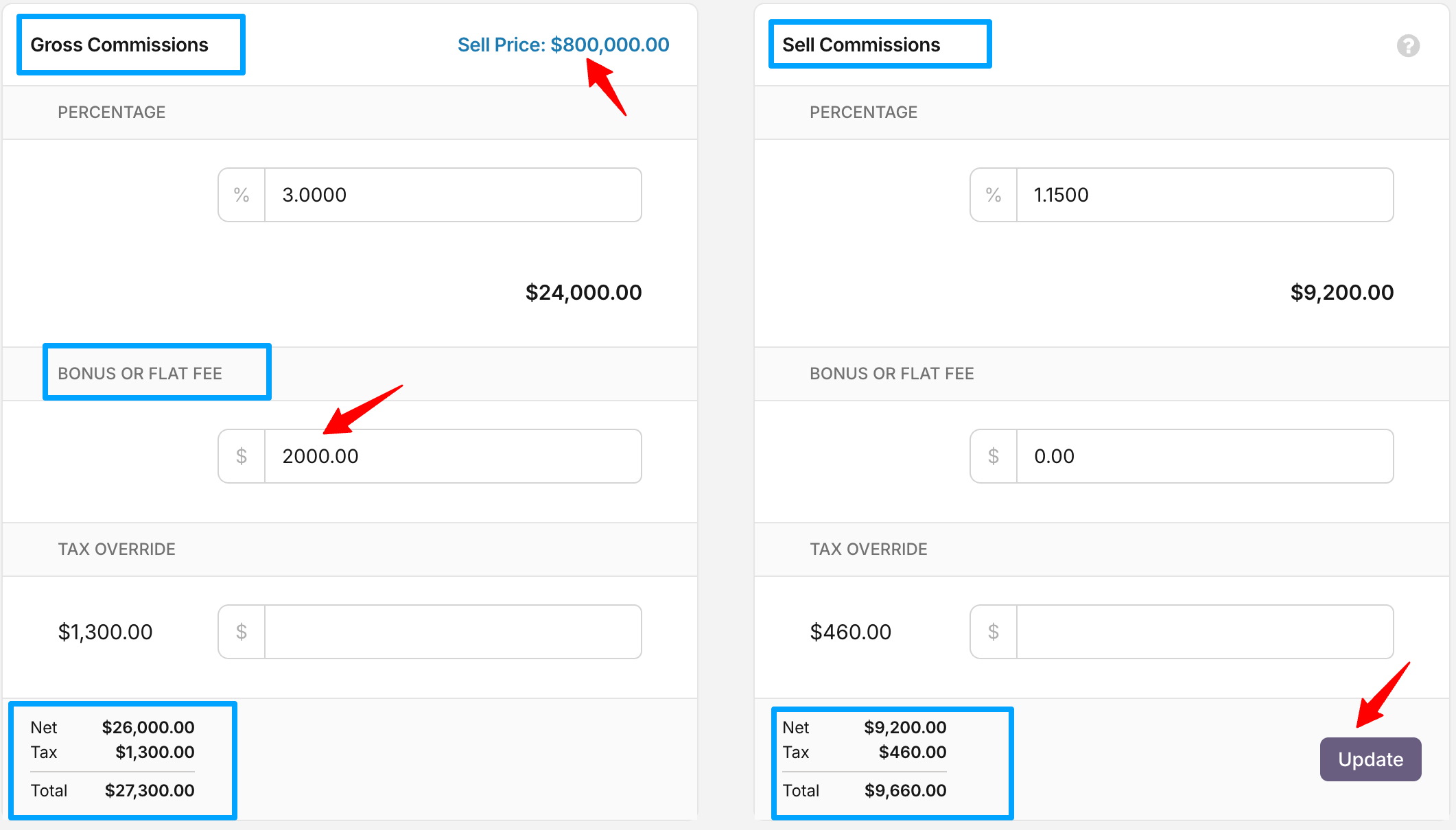 Gross Commissions: 3% of the price $24,000 + Bonus $2000 = $26,000 plus tax $1,300.00 = $27,300.00