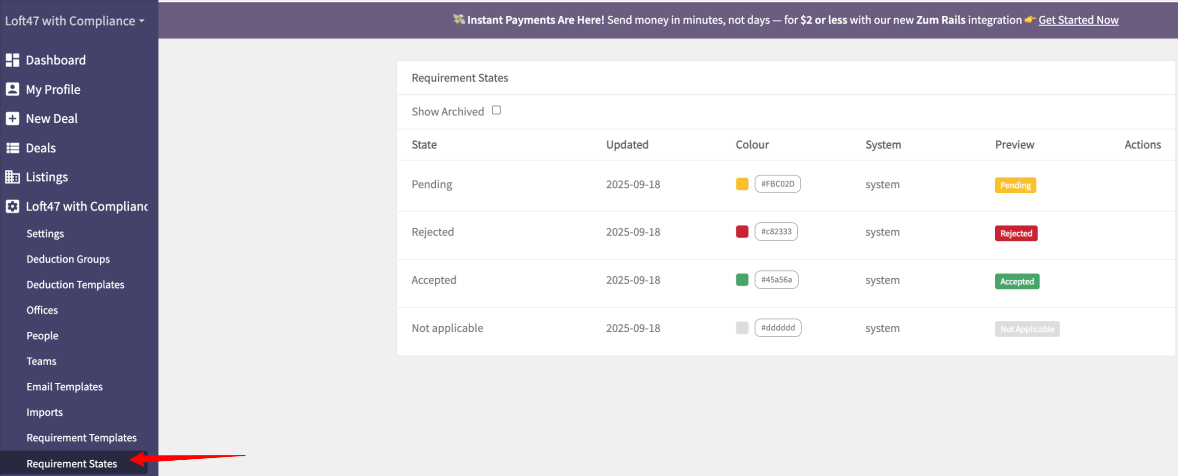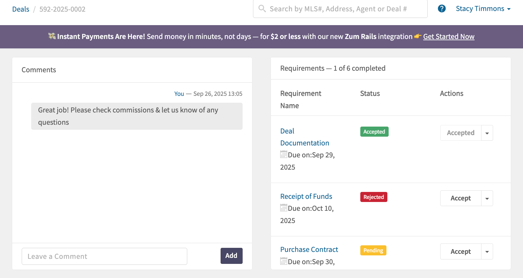 Loft offers a Requirements checklist, a place where you can add any document or action (workflow) requirements to the Deals for ease of tracking compliance. Please note, Loft is not a compliance automation solution, so if agents are missing ...