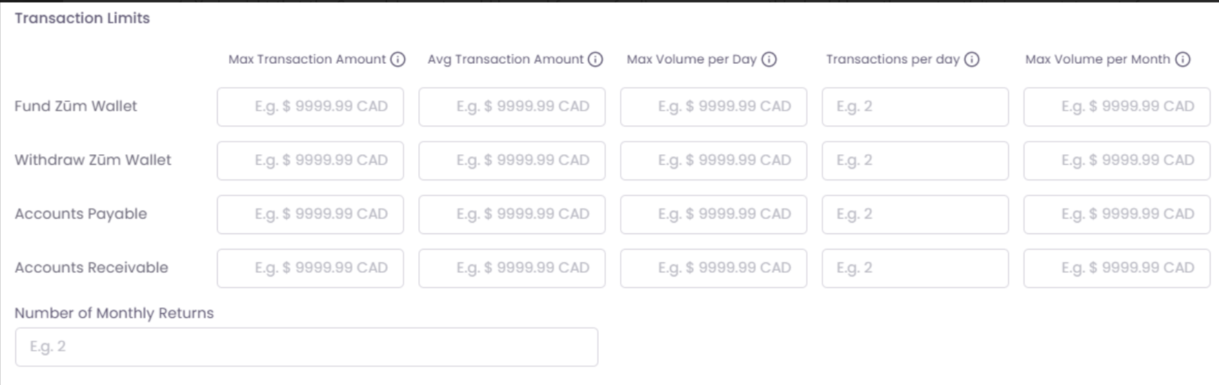 Max transaction amount: This should be the highest commission paid out to a single Agent. e.g. $200,000Avg transaction amount: This should be the average amount of commissions paid out. This is an estimate, so you can view Loft data or use your best guess and estimate an amount slightly higher. e.g. $10,000Max volume/day: This would be the maximum volume from payouts you do in an average day. (This should be the number of payouts you do times the average commission amount, and add a little extra to cover you in the busy season.) e.g. $60,000Transactions/day: The number of payments from this account on an average day. e.g. 5 Max Volume/Month: This is the maximum you will pay out in a month, take the daily maximum and multiply by 20 working days or more if you operate over the weekend. e.g. $1,200,000